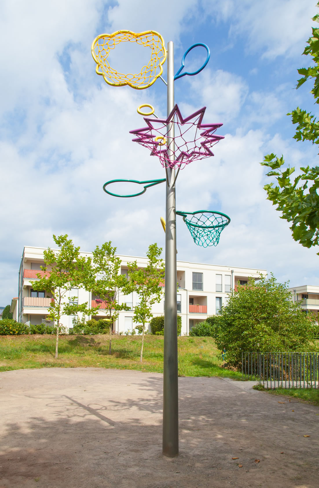 Verortet auf einer ovalen Fläche des Schulhofes markiert der Baum diese als Treffpunkt der Schüler*nnen. Die Sprech- und Denkblasen sind eine globale Ikonografie und visualisieren Emotionen im Geäußerten. Mit ihnen wird laut gesungen, entsetzt gerufen oder still gepostet.