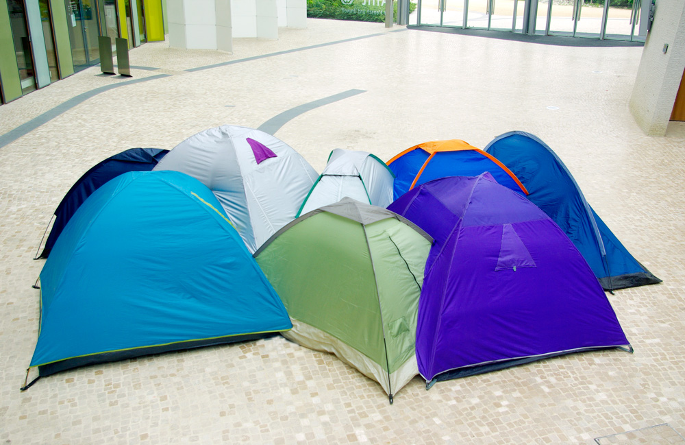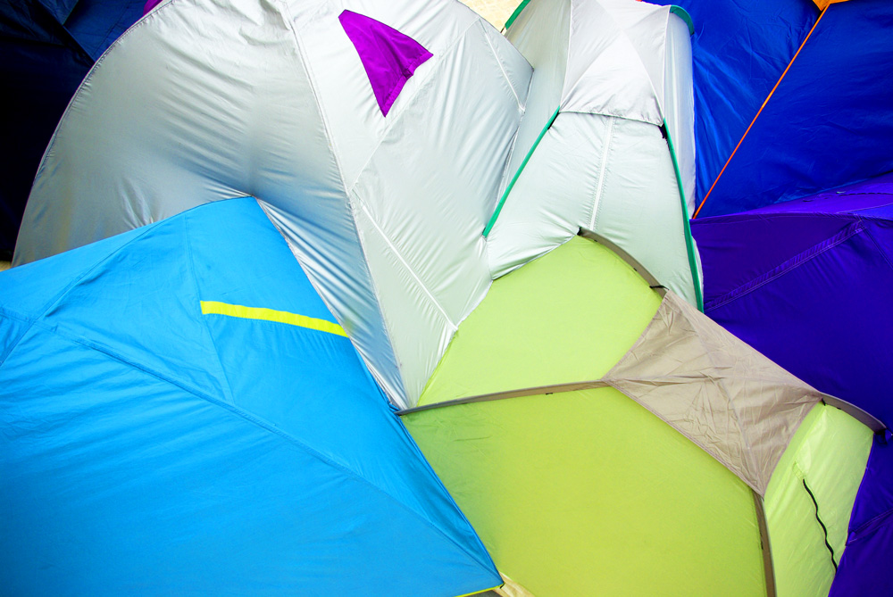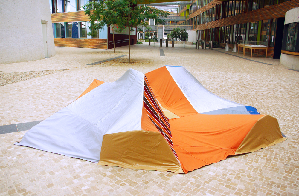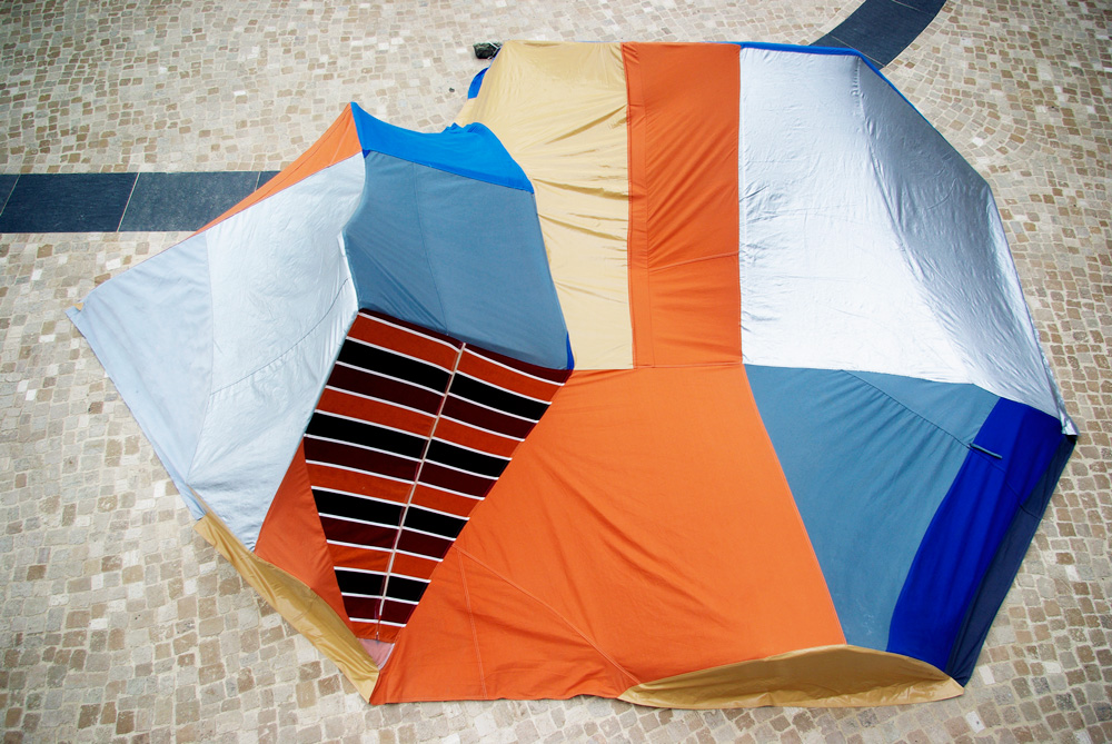 Ganze Berglandschaften entstehen aus vielen zusammengenähten Zelten. Diese bieten dem "Naturcamper" eine Unabhängigkeit von realen Bergpanoramen, da sie stets und überall inszenierbar sind. Es geht um die Vorstellung, solch ein umständlich großes Gebilde zu falten und im Trekkingrucksack zu verstauen und dabei fest an das teuer erworbene Versprechen einer vollkommenen Autarkie glauben.