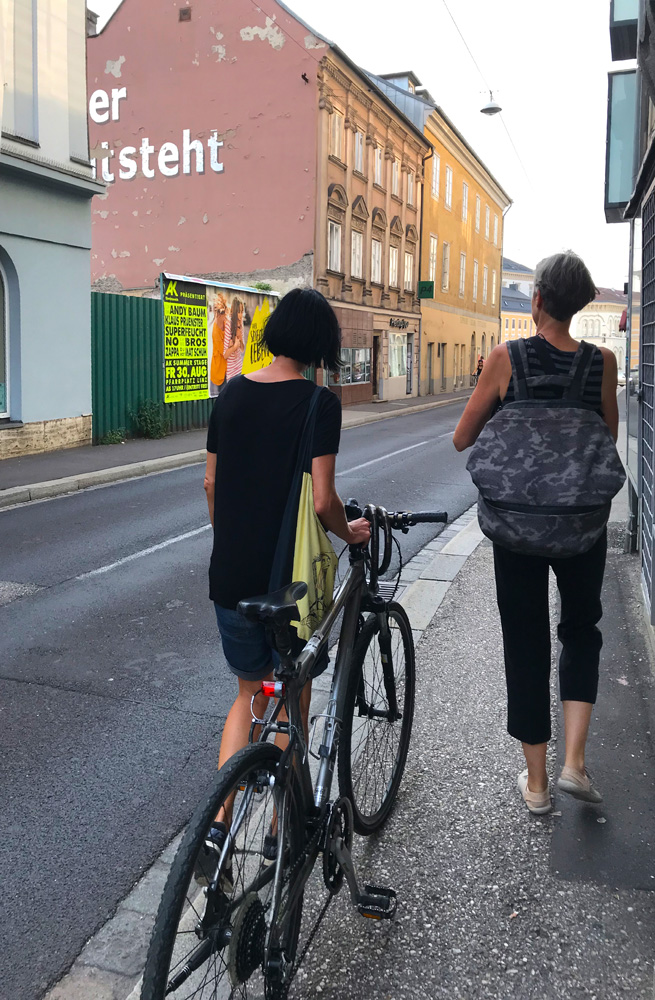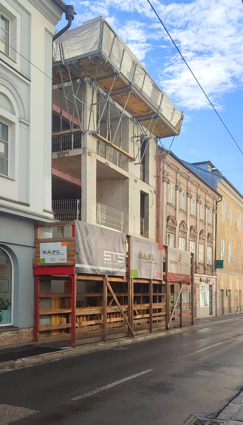 Frühjahr 2020. Um für den Neubau mehr Platz zu machen, wurde mittlerweile das Nachbargebäude des Elektrofachhändlers Wallner abgerissen. Der geplante Baubeginn verzögert sich. Die Corona-Epidemie hat eine große Pause eingeführt. Derweil das Silber immer weiter oxidiert und eine kupferfarbene, orangen glänzende Patina erhält.