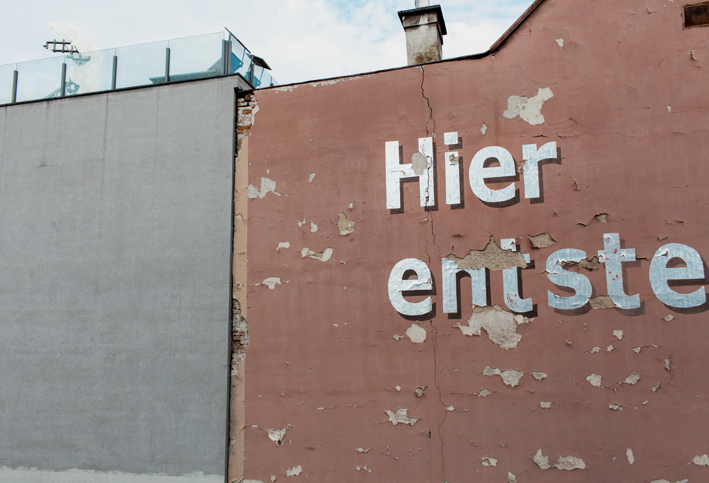 Der anachronistisch anmutende Schriftzug ist mit echtem Blattsilber auf die alte poröse Wand des denkmalgeschützten Hauses aufgetragen. Sukzessive wird er während der Bauphase im Zwischenraum verschwinden und schließlich nicht mehr sichtbar sein. So wird die Wand mit ihrer Geschichte und einem wertvollen Zukunftsversprechen vereint und für eine unbestimmte Zeit konserviert. Es ist ein Gedankenspiel, ob und unter welchen Umständen er einmal entdeckt und zugänglich gemacht wird.