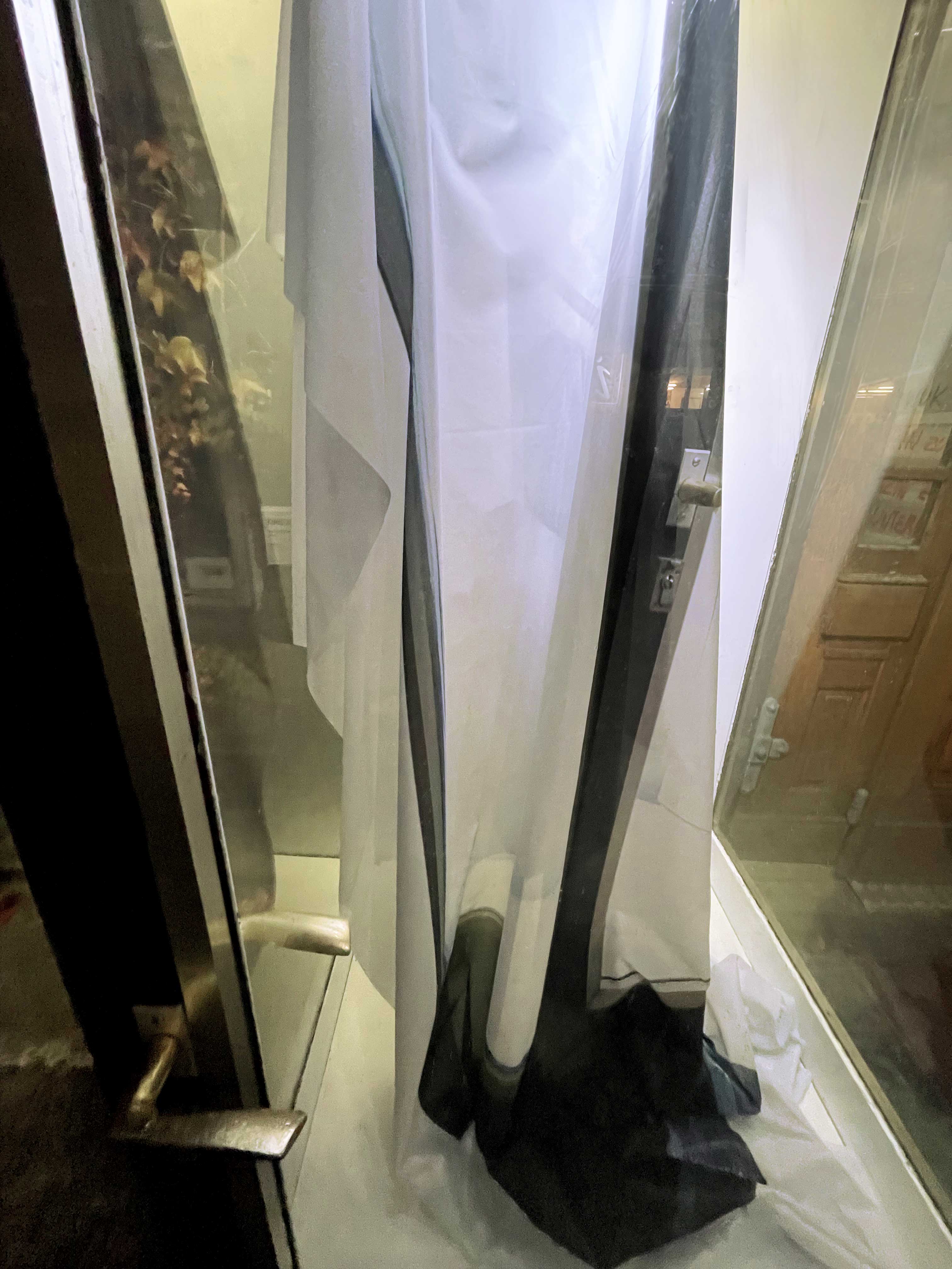 Eine ehemalige Telefonzelle ist seit über 15 Jahren Ort für künstlerische Installation und Intervention. Bevor die Kunstzelle für umfangreiche Sanierungsarbeiten des Gebäudekomplexes vorübergehend weichen muss, wird die letzte Ausstellung zum Anlass, die An- und Abwesenheit des Ortes zu thematisieren. Während ein Textildruck mit dem Abbild der Zelle an Verhüllungen erinnert und die Zelle in den Faltungen fragmentiert wird, bleibt der innerhalb des 12.000 qm großen Zentrums kleinste Veranstaltungsort, die Kunstzelle, über den Dächern Wiens weit sichtbar. - bis er wieder da ist.