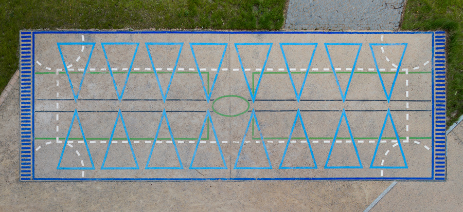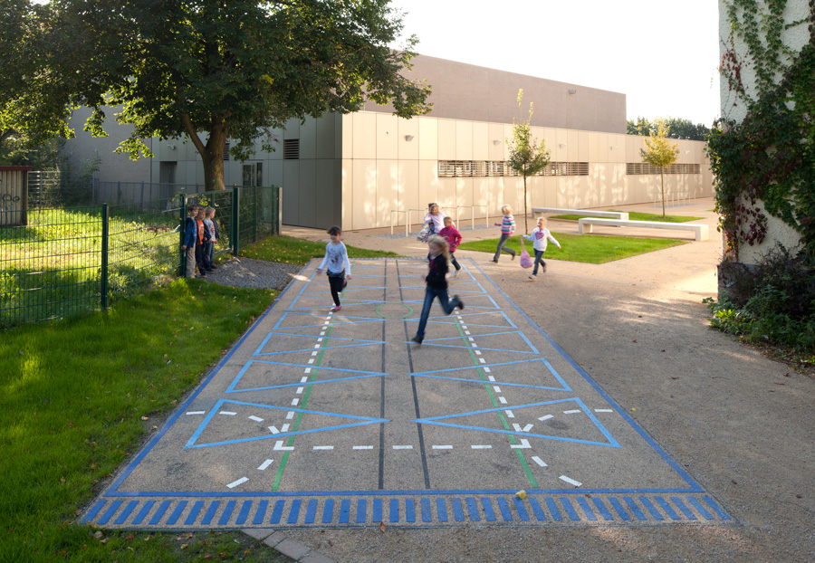 Ausgehend von dem unübersichtlichen Grundschulgelände und dem Neubau der Sporthalle, der sich hinter dem Schulgebäude verbirgt entsteht mit dem Motiv zweier Teppichläufer ein Wegweiser zur Sporthalle und zugleich ein verbindendes Element des Schulgeländes.