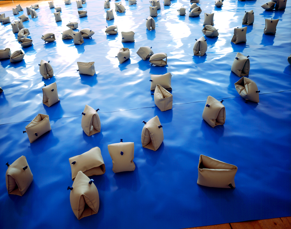 “The cream colored artificial leather swimming wings, resemble floating prosthetics; a metapher for caution and unhesitant joyfulness in deceptively shallow “wet”
