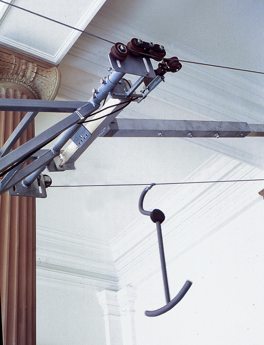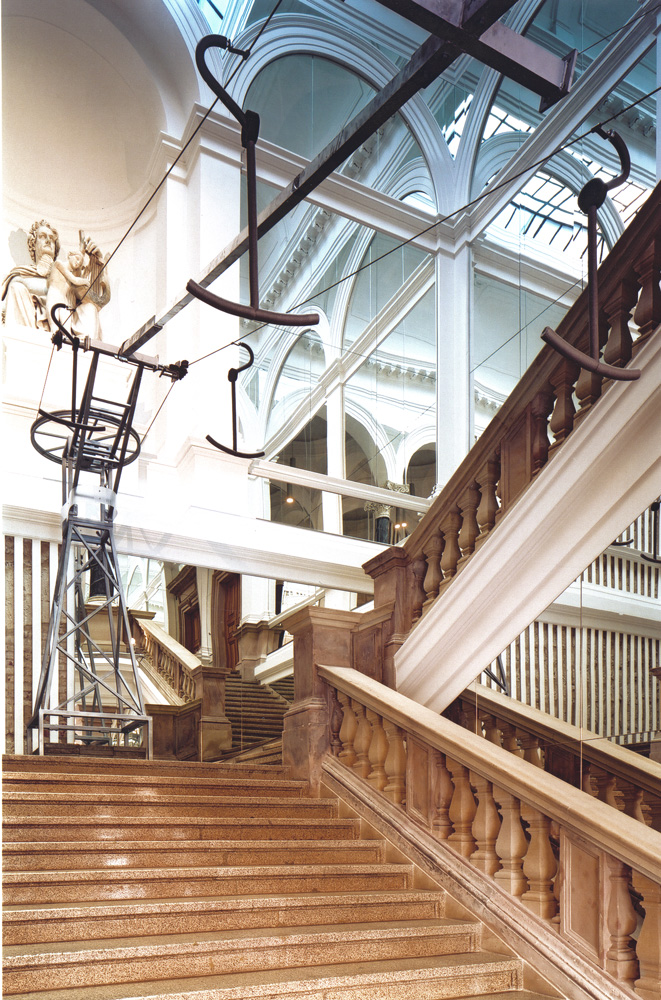 Stahl, Aluminium, Elektromotor, Beton, Gummi, Plexiglas, Schaumstoff, Silbermetalllack, Höhe 3,20 m je Turm, Grundfläche je 1 x 1m, Distanz zwischen den Türmen ca. 9 m (variabel)