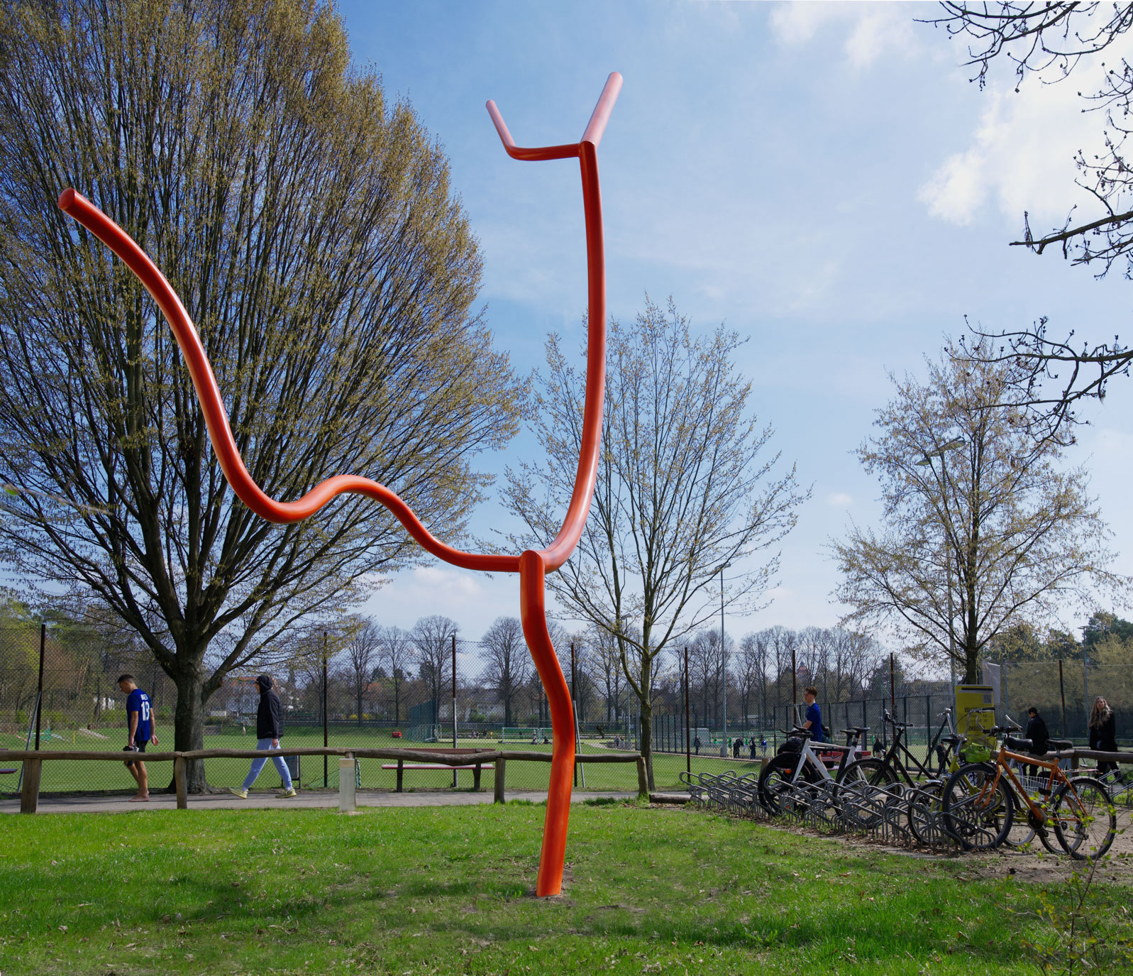 Werfen, Springen, Stürmen und Jubeln spiegeln sich in der emporragenden Geste des Wilden Tores wider. Das Sportareal wird Schauplatz eines zügellosen Wesens, eines hybriden Wesens, das sich zwischen der Norm eines Fußballtores und einer fliessenden Bewegung befindet. Mit seiner Morphologie fordert es eine humorvolle Körperwahrnehmung ein.
