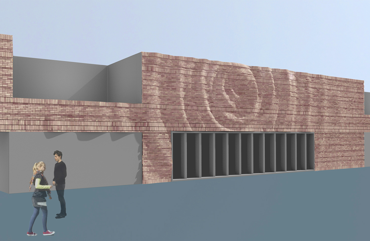 The wave-like deformation of the facade opens up the idea of making the inside of the school perceptible on the outside without questioning the building as a protective space: With the waves, everything, that is said, articulated, sung and performed, is transmitted abstractedly through the outer wall. The events penetrate to the outside and transform the facade into a vibrating membrane.