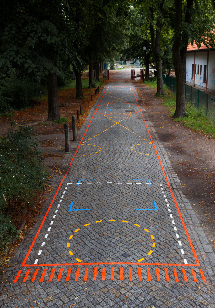 Ausgehend von dem unübersichtlichen Grundschulgelände und dem Neubau der Sporthalle, der sich hinter dem Schulgebäude verbirgt entsteht mit dem Motiv zweier Teppichläufer ein Wegweiser zur Sporthalle und zugleich ein verbindendes Element des Schulgeländes.