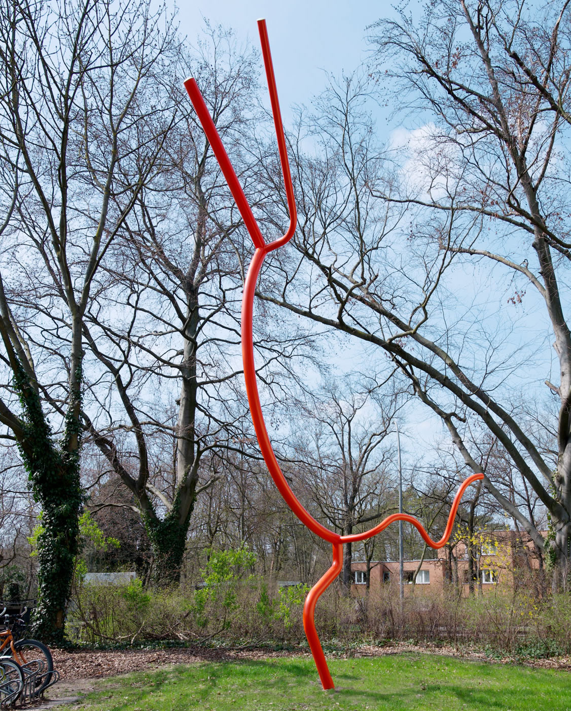 Werfen, Springen, Stürmen und Jubeln spiegeln sich in der emporragenden Geste des Wilden Tores wider. Das Sportareal wird Schauplatz eines zügellosen Wesens, eines hybriden Wesens, das sich zwischen der Norm eines Fußballtores und einer fliessenden Bewegung befindet. Mit seiner Morphologie fordert es eine humorvolle Körperwahrnehmung ein.